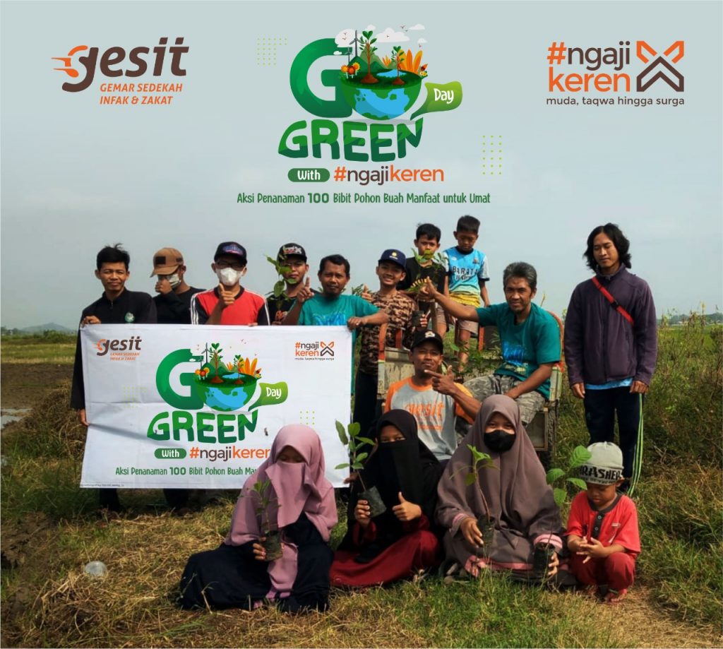 #NgajiKeren, tempat ngajinya anak muda Sukoharjo yang menjadi sayap dakwah generasi muda binaan GESIT mengadakan event mulia nan keren bertajuk Go Green Day, Aksi Penanaman 100 Bibit Pohon Buah Manfaat untuk Umat. Hibah dari Program Kampung Iklim (Proklim Sukoharjo) berupa jambu air, sukun, rambutan, dan duwet manis ini berlokasi di Kidul Wangan, Tangkisan, Sukoharjo, Ahad 26/6/22. Event keren ini diikuti oleh puluhan putra dan putri muda muslim anggota #ngajikeren.